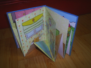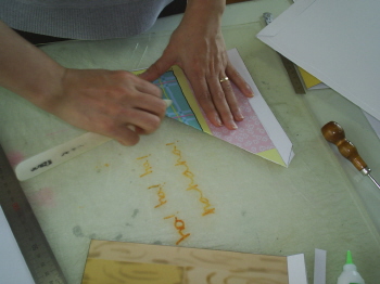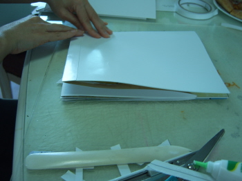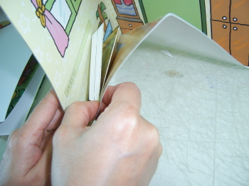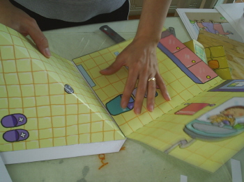 (월래의 풀칠, 가구붙이는 자리를 무시하고, 밑면을 바닥에 붙인 다음, 책을 접은 상태에서 붙여지게 되는 면에 풀칠을 하고 붙이도록 한다.