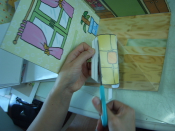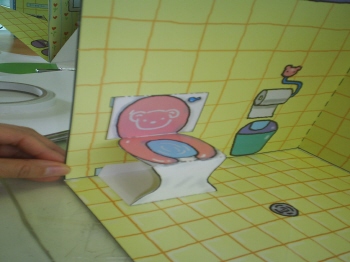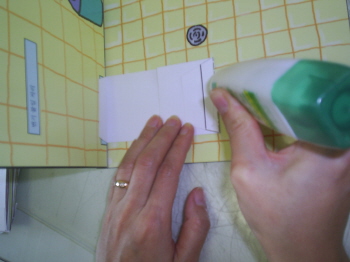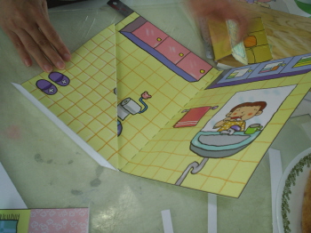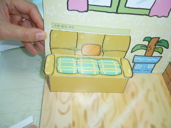5-3-1: 소파, 변기, 책상을 붙일 때는 바다면을 먼저 풀칠해서 붙인다. 이 때, 바닥에 풀칠해서 고정을 시켜야하기 때문에, 소파의 경우 풀칠면은 자르고 신제 그림의 밑면에 풀칠을 하도록 한다.