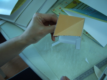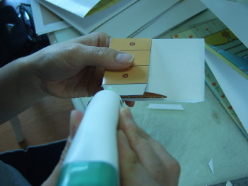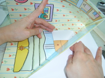5-2-3: 밑면과 배경을 붙인다. 배경면을 붙일때도 접은 상태에서 붙여간다. 배경의 접힌 부분들과 각가의 바닥면이 잘 붙도록 주의하며 붙여간다.