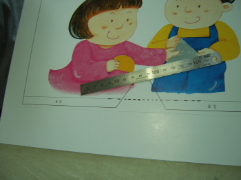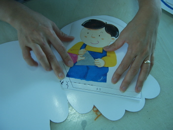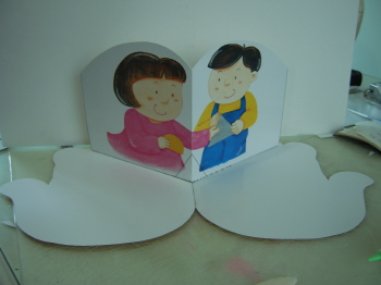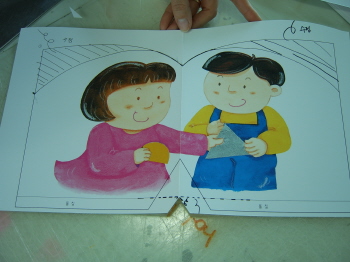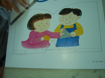 9-2-1: 책 그림의 중앙에 송곳으로 접는선을 만들어 접어준다(내용그림을 붙일 때 기준선이 된다.).