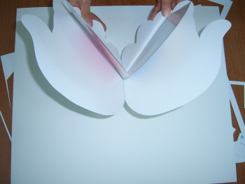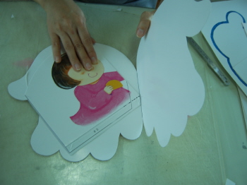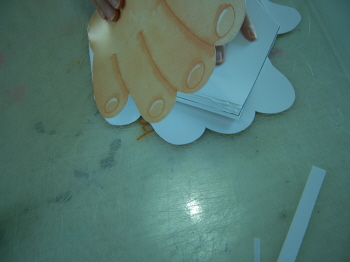 9-1-1: 수정할 부분들 -> 그림과 같이 풀칠부분을 연장하고, 횐 여백의 부분은 잘라 손 모양 안에 그림이 다 들어갈 수 있도록 한다.